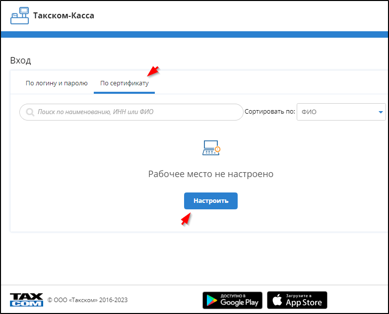 Если компьютер не настроен для работы с ключом ЭП, то необходимо нажатием кнопки перейти на страницу «Мастера настройки» install.taxcom.ru  и  выполнить настройки с его помощью.