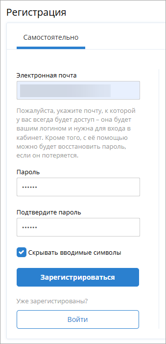 На следующей странице ввести email и назначить пароль, после чего нажать Зарегистрироваться :