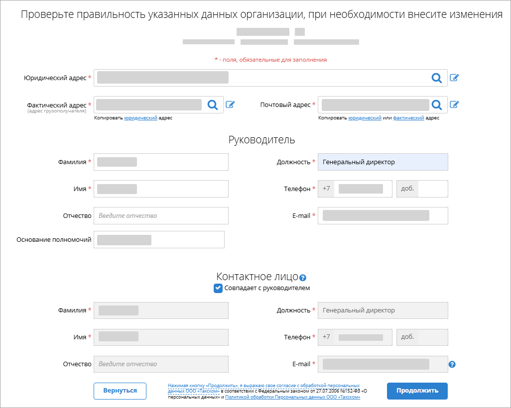Откроется окно для ввода реквизитов, при этом автоматически выполняется заполнение бланка данными из ЕГРЮЛ/ЕГРИП. Необходимо проверить эти данные и, при необходимости, отредактировать, после чего согласиться с обработкой персональных данных, нажав Продолжить в нижней части страницы: