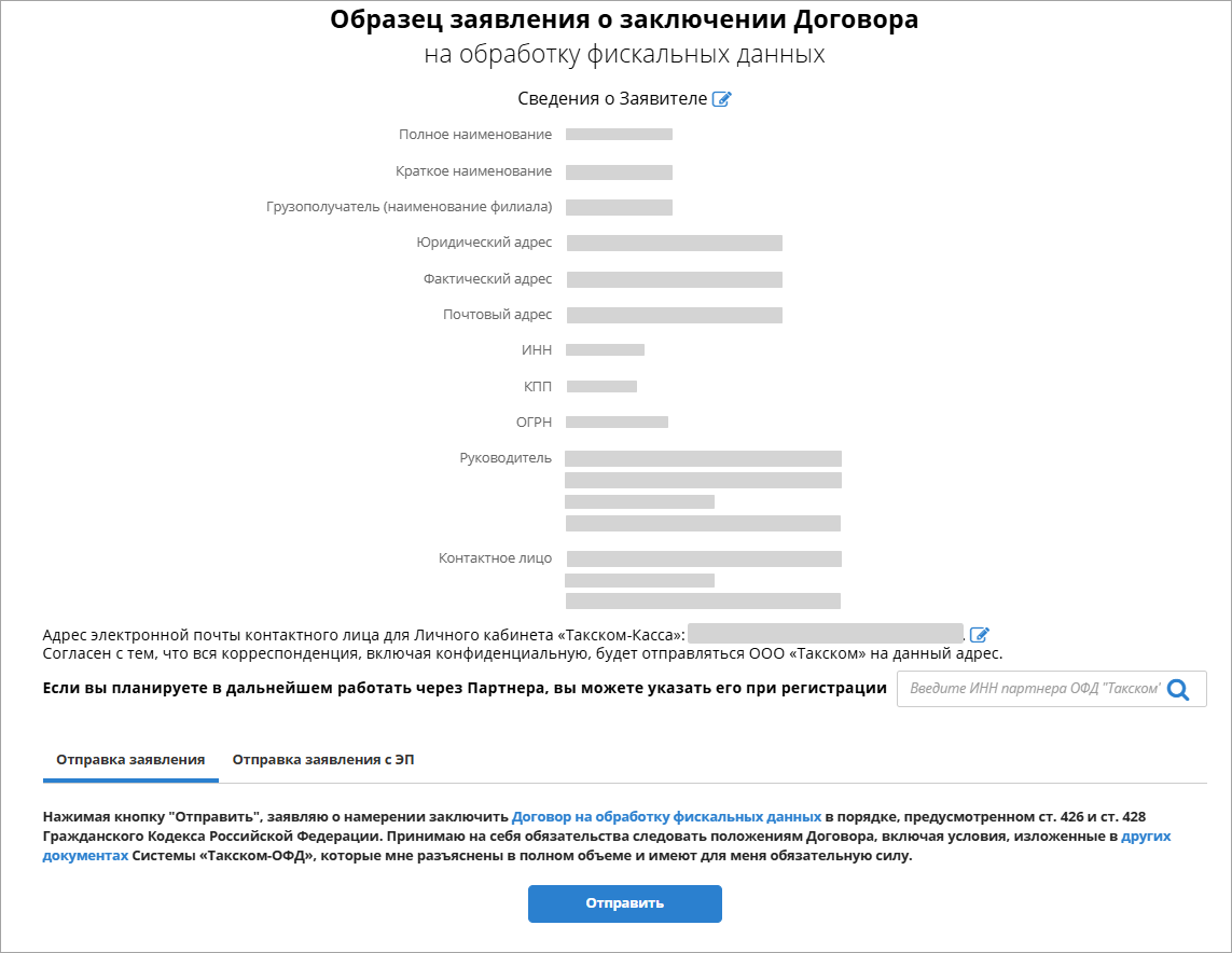 На следующей странице можно ещё раз проверить заявление перед регистрацией. При необходимости можно перейти к редактированию заявления и указать партнера ОФД (ЦТО).